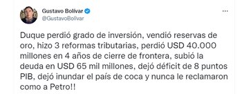 “Duque perdió grado de inversión, vendió reservas de oro, hizo 3 reformas tributarias, perdió USD 40.000 millones en 4 años de cierre de frontera, subió la deuda en USD 65 mil millones, dejó déficit de 8 puntos PIB, dejó inundar el país de coca y nunca le reclamaron como a Petro!!”, afirmó Bolívar.
