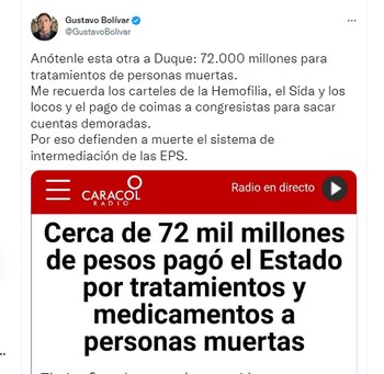 “Cerca de 72 mil millones de pesos pagó el Estado por tratamientos y medicamentos a personas muertes”, lee el titular que compartió Gustavo Bolívar y el cual fue publicado por Caracol Radio. En la misma imagen difundida en las redes sociales del senador también se puede leer, “el vicefiscal general anunció que vendrán nuevas capturas por el escándalo de corrupción al interior del sector salud y no se descarta que sean funcionarios públicos o de EPS”.