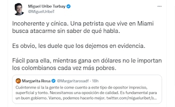 “Incoherente y cínica. Una petrista que vive en Miami busca atacarme sin saber de qué habla. Es obvio, les duele que los dejemos en evidencia. Fácil para ella, mientras gana en dólares no le importan los colombianos cada vez más pobres”, afirmó contundentemente el senador Uribe Turbay en su cuenta de Twitter.