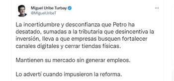 “La incertidumbre y desconfianza que Petro ha desatado, sumadas a la tributaria que desincentiva la inversión, lleva a que empresas busquen fortalecer canales digitales y cerrar tiendas físicas. Mantienen su mercado sin generar empleos. Lo advertí cuando impusieron la reforma”, aseguró el senador Miguel Uribe en su cuenta de Twitter.
