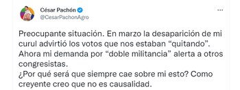 “Preocupante situación. En marzo la desaparición de mi curul advirtió los votos que nos estaban “quitando”. Ahora mi demanda por “doble militancia” alerta a otros congresistas. ¿Por qué será que siempre cae sobre mi esto? Como creyente creo que no es causalidad”, aseguró Pachón.