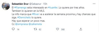 Sin embargo, en el tuit de Srur también se lee de la intención del nuevo técnico de River Plate, Martín Demichelis y sus directivas de quedarse con el antioqueño. Incluso el mánager del equipo, Enzo Francescoli, declaró recientemente sobre el objetivo con Juanfer: “Nuestra idea es que Quintero siga en el club. El plantel que está, sigue el año que viene”.