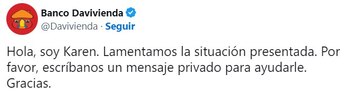 La entidad bancaría que se habría visto involucrada es Davivienda por lo que las personas decidieron buscar respuesta por parte de los funcionarios pero debido al horario no había atención. La respuesta oficial que se dio por parte de la entidad bancaria fue desde las redes institucionales donde invitaron a comunicarse personalmente con ellos para solucionar los inconvenientes.