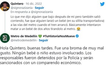 “Lo que me dijo alguien que bajo después de mi pero también salió corriendo, fue que alguien lanzó un bebé (en su sillita transportadora) a las vías del metro cuando el tren arrancó. Básicamente intentaron matar a un bebé de dos años tirándolo al metro” a lo que se respondió desde las redes oficiales del Metro de Medellín: “Hola Quintero, buenas tardes. Fue una broma de muy mal gusto. Ningún bebé o niño estuvo involucrado. Los responsables fueron detenidos por la Policía y serán sancionados con un comparendo económico”.