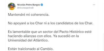 El hijo del presidente Gustavo Petro afirmó en su cuenta oficial de Twitter que, “mantendré mi coherencia. No apoyaré a los Char ni a los candidatos de los Char. Es lamentable que un sector del Pacto Histórico esté haciendo alianzas con ellos. Ya sucedió en la Universidad del Atlántico. Están traicionado al Cambio”.