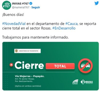 Precisamente en el festivo de este lunes 9 de enero, las autoridades reportaron un gran deslizamiento que ha hecho que gran parte del sur del país esté incomunicado. Se trata de un derrumbe reportado en la en la vía Panamericana, más exactamente en la zona que conecta a Popayán con el municipio de Rosas, en el departamento del Cauca. Según indicó el Instituto Nacional de Vías (Invías) en la vía Mojarras-Popayán, en kilómetro 75 sobre el sector Rosas ocurrió el derrumbe por lo que la vía debió ser cerrada en ambos sentidos.