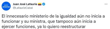 “El innecesario ministerio de la igualdad aún no inicia a funcionar y su ministra, que tampoco aún inicia a ejercer funciones, ya lo quiero reestructurar”.