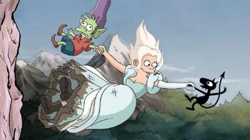 "Es la suma de Game of Thrones y Los Simpson", les aseguró a los comandantes de la plataforma más famosa para venderle el proyecto. Pero la serie poco y nada tiene de esa mezcla. (Des)encanto ofrece, por primera vez en los trabajos de Groening, una protagonista femenina: la Princesa Bean. Una veinteañera que desprecia la nobleza y la idea de casarse por un arreglo entre familias. La chica rebelde de pelo blanco solo quiere bañarse en cerveza mientras atraviesa una crisis existencial. Pero no es la única: un Elfo que ambiciona abandonar el azúcar para conocer el sabor amargo del melodrama y un demonio de bolsillo la compañarán en sus fracasos cotidianos, como si fueran los tres chiflados de la era feudal.