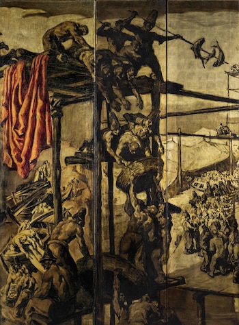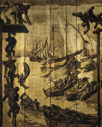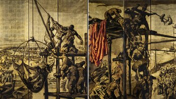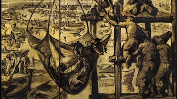 Maastricht, enviada especial. Son 28 paneles imponentes pintados al óleo sobre lienzo y entre todos miden un largo de casi 15 metros por 2,50 de alto. En diversas tonalidades de ocre y marrón -apenas unos toques de rojo- las imágenes patinadas representan escenas de pesca con gran despliegue de trabajadores, acorde a la época en que fue realizado, 1938. El autor del monumental "biombo" fue el catalán José María Sert (1874-1945), quien aunque hoy sea poco conocido, en su tiempo fue un artista exitoso y de moda, un elegido por las clases altas del mundo para decorar sus casas. Las imágenes que ahora están en el MECC, el centro convenciones de Maastricht, eran las que cubrían las paredes del salón de música del piso 14 del Kavanagh, el célebre rascacielos de la porteña calle Florida que durante varias décadas fue el más grande de Sudamérica. En ese piso vivía Corina Kavanagh, la mujer que ordenó la construcción del edificio, una iniciativa que algunos aún señalan como una forma de venganza amorosa. La obra puede verse por estos días montada en el stand de los prestigiosos anticuarios franceses Kugel. Está a la venta.