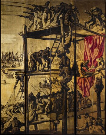 La monumental escena muestra a hombres de mar pero ya en tierra: algunos sacan pescados de las redes para meterlos en cajas, otros pescan con caña y otros miran cómo se pesca. Algunos más están subiendo o ya están arriba de unos andamios en una imagen que algún crítico de arte destacó como inverosímil. En el centro, un grupo de pescadores levanta un pescado enorme. Más atrás se ven barcas modestas y otras clases de embarcaciones y también alguna imagen desconectada de esa escena pero pintada allí en un gesto de libertad o capricho del artista, según se mire, como El Cuerno de Oro de Estambul, el santuario en forma de cuerno que desemboca en el Bósforo, con sus cúpulas y minaretes. Hay repetición de motivos, algo clásico en su obra, según señalan los expertos.