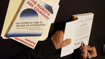 Andrés Oppenheimer presentó en Miami The Robots Are Coming!, la versión en inglés de su último libro, ¡Sálvese quien pueda!, en el que analizó cómo cambiará el trabajo humano en el futuro cercano de la automatización y la inteligencia artificial. "Me preocupa el futuro cercano, no el largo plazo: la señora que acaba de perder su empleo en el estacionamiento de enfrente, de un día para otro, reemplazada por una caja automática de pagos, no puede reinventarse en 24 horas".