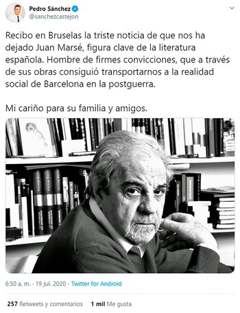 “Recibo en Bruselas la triste noticia de que nos ha dejado Juan Marsé, figura clave de la literatura española. Hombre de firmes convicciones, que a través de sus obras consiguió transportarnos a la realidad social de Barcelona en la postguerra. Mi cariño para su familia y amigos”, dijo en Twitter, el presidente del gobierno español, Pedro Sánchez.
