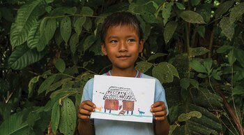 Cuando volvimos a Buenos Aires comenzamos a armar nuestro siguiente proyecto: dar talleres en escuelas rurales de todas las provincias de Argentina. Y así fue, durante un año dibujamos con chicos y chicas desde Jujuy a Tierra del Fuego. En el medio del camino nos enamoramos de Traslasierra, Córdoba, y acá nos vinimos a vivir una vez terminada la recorrida, hace casi un año y medio. Hace seis meses nació Camilo, nuestro primer hijo. Durante su gestación, estuvimos muy abocados a este libro Pequeños Grandes Mundos, la vida en dibujos y estamos muy felices de que ya esté en las librerías para compartir todo eso que teníamos en nuestras cabezas con muchas ganas de salir. No fue fácil porque conocimos a miles de chicos, familias, lugares tan distintos. Teníamos que elegir entre miles de fotazas de la genia de Sofía Nicolini Llosa que nos acompañó en la aventura, cientos y cientos de dibujos que hicieron los chicos en los talleres e infinidad de historias por contar.