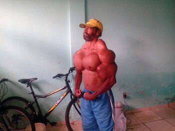 Sus biceps constituyen un récord en Brasil: 58 centímetros de diámetro gracias a sus esfuerzos de fitness y sus aceites. Pero quiere ir por más. Quiere ser famoso. Dice que siempre se inspiró en el actor Arnold Schwarzenegger, quien fuera fisicoculturista durante los 70 y 80.