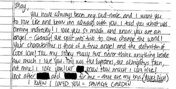Debajo del mensaje, la nota manuscrita hace referencia a la canción "I Knew I Loved You" de Savage Garden.
