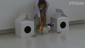Tras algunos segundos de duda, el gato optó por el cuenco australiano, pero sin tocar la comida.