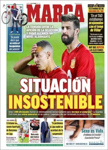 Por su parte, en el diario AS informan que "la actitud de Piqué y sus declaraciones han terminado por provocar un ambiente irrespirable" y destacan que su vínculo con Sergio Ramos, capitán del Real Madrid, ya está totalmente roto: "La relación entre Piqué y Sergio Ramos se ha quebrado definitivamente. La reunión de este lunes fue muy tensa para el catalán, 'que ya veremos si resiste la presión y no abandona la concentración' (…) Ramos ya le avisó la semana pasada que con sus tuits no ayudaba a apaciguar el ambiente y Piqué no sólo no ha hecho caso, sino que ha ido a más."