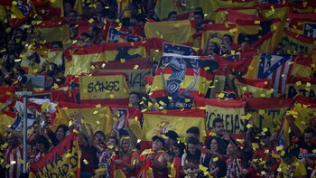 Si bien la independencia quedó suspendida, según anunció Carles Puigdemont, presidente de la Generalitat, y ahora habrá que aguardar un diálogo para llegar a una solución, los seguidores del Atlético se hicieron oír. Además, el recibimiento al conjunto local estuvo acompañado de papeles amarillos y rojos, colores de la bandera española.