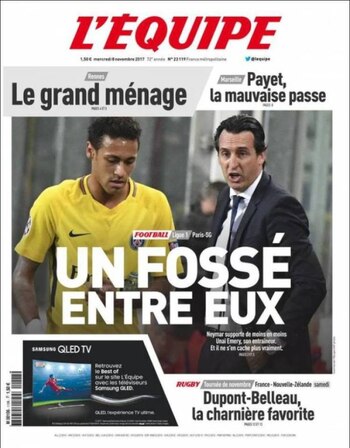 La noticia ocupa la portada del diario deportivo, que utilizó una imagen del jugador y el estratega, y tituló: "Un abismo entre ambos". La distancia entre Neymar y Emery es cada vez es más grande, aunque todo indica que deberán soportarse por mucho más tiempo.