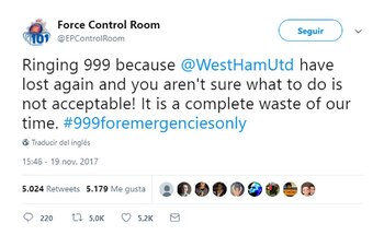 "Llamar al 999 porque el West Ham United ha vuelto a perder y ustedes no saben que hacer ¡es inaceptable! Es una completa perdida de nuestro tiempo #999SóloParaEmergencias", escribió la Policía de Essex en su cuenta de Twitter.