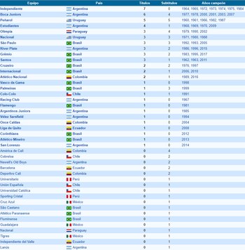 Los conjuntos más ganadores del continente siguen siendo Independiente (7) y Boca (6) de la Argentina, seguido por Peñarol de Uruguay con 5 y Estudiantes de La Plata (Argentina) con 4.