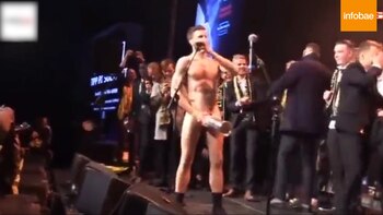 Para tapar sus partes íntimas, alguien le alcanzó el trofeo y el futbolista se puso sus genitales dentro de la copa, ante las carcajadas del resto de los jugadores.