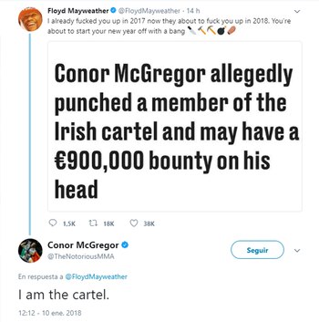 Ahora, a poco más de un mes de aquel episodio, el estadounidense aseguró: "Ya te jodí en 2017 y ahora te van a joder en 2018. Estás a punto de comenzar tu nuevo año con un balazo", y publicó un encabezado sobre aquella noticia. Pero McGregor no se quedó atrás y arremetió: "Yo soy el cártel".