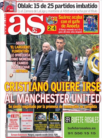"Cristiano quiere irse al Manchester United". Así, concreto, sin rodeos, es el titular del diario As de este lunes. El medio, uno de los más reconocidos en España y de reconocida inclinación madridista, aseguró que el portugués está enojado y que, incluso, ya le comunicó a algunos de sus compañeros que se irá al finalizar la vigente temporada.