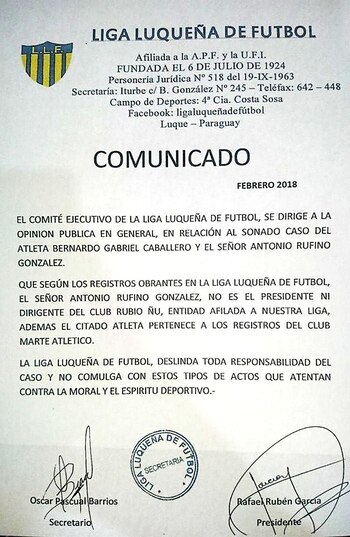 "Según los registros obrantes en la Liga Luqueña de Fútbol, el señor Antonio Rufino González no es el presidente ni dirigente del club Rubio Ñu, entidad afiliada a nuestra liga", se pudo leer en el informe, el cual también detalló que el empresario "pertenece a los registros del club Marte Atlético".