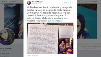 Débora Mansur, su bisnieta, decidió ayudar a su familiar al hacer viral la esquela por medio de las redes sociales. "Mi bisabuela es fan #1 de Nadal y siempre le escribe cartas y se las manda hasta España. Como jamás ha recibido respuesta, le pedí que escribiera una para Twitter y me dio esto…le harían el día si me ayudan a que Nadal la lea. Plis", dice la publicación que recibió más de 19.000 retuits.