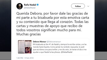Para sorpresa de Gloria y Débora, al ganador de 16 Grand Slams le llegaron las palabras de la anciana y se mostró muy coplacido: "Querida Debora, por favor dale las gracias de mi parte a tu bisabuela por esta emotiva carta y su contenido que llega al corazón. Todas las cartas y muestras de apoyo que recibo de todos vosotros significan mucho para mí. Muchas gracias".