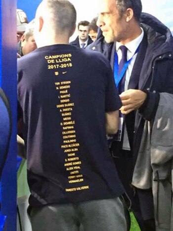 "Campeones de Liga. La mitad también es mía, ¿no?", comentó el punta catalán en su cuenta oficial de Twitter a la vez que adjuntaba la foto de la camiseta en la que no aparece su nombre ni el de sus otros dos compañeros.