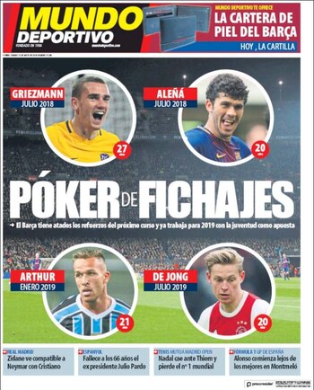 Según informó la prensa catalana, el Barça tiene "atados" a cuatro jugadores: Antoine Griezmann (27 años), Arthur (21), Carles Aleñá (20) y Frenkie De Jong (20). El delantero francés del Atlético es el más consagrado en un póker de jugadores con mucho potencial.