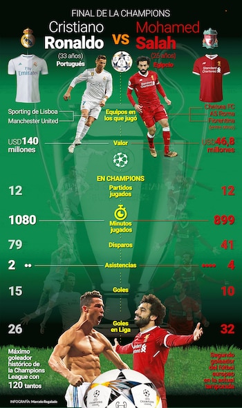 Cada uno a su estilo y desde su lugar. Un experimentado jugador como Cristiano Ronaldo, que ha demostrado ser experto en anotar en finales y que brilla desde hace más de una década, se enfrenta a Mohamed Salah y su enorme presente, con el que se ha dado a conocer al mundo y ha osado con plantarse de igual a igual a los reyes de este deporte. En la final de la Champions League, el mejor de los partidos del fútbol europeo, donde todo es posible pero a la vez muy incierto.