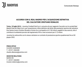 "La Juventus comunica que ha alcanzado un acuerdo con el Real Madrid por la adquisición definitiva de Cristiano Ronaldo por un correspondiente a 100 millones de euros, más allá de la contribución de solidaridad prevista por las regulaciones de FIFA y los cargos extra en 12 millones", fue el texto que lanzó oficialmente el equipo de Turín.
