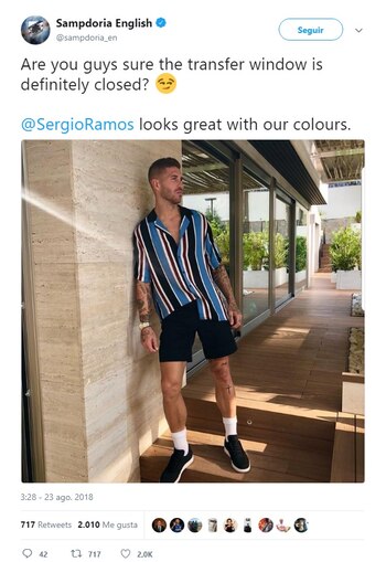"¿Están seguros de que la ventana de transferencias está definitivamente cerrada? Sergio Ramos luce fantástico con nuestros colores", fue el mensaje que acompañó a la imagen en la cuenta de Twitter en inglés de la Samp, que mencionó al futbolista.
