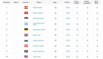 A la fecha, son 1860 puntos los que separan a Rafael Nadal, N°1 de la clasificación mundial, de Roger Federer, su escolta, mientras que el tercero, el serbio Novak Djokovic, reciente ganador del US Open, se coloca a 2315 puntos del mallorquín.