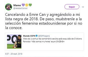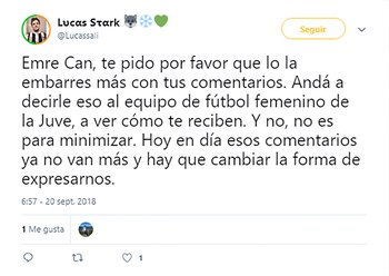 "Emre Can, te pido por favor que no la embarres más con tus comentarios. Andá a decirle eso al equipo de fútbol femenino de la Juve, a ver cómo te reciben", le advirtió un fanático de la Juventus. "Qué repugnancia me producen estos machitos que no han visto en su vida a una mujer jugar al fútbol", aseguró una aficionada.