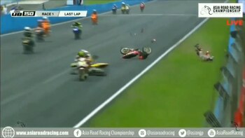 El choque se produjo en la categoría Underbone 150 en la que las motos de los primeros pilotos se amontonaron a metros del final, lo que provocó la caída de Izzat Zaidi después de que su rueda delantera tocara la trasera de la moto del otro corredor.