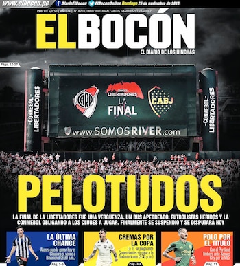 "Pelotudos", es la palabra que utilizó "El Bocón" para definir todo lo que sucedió en la tarde/noche de ayer en las inmediaciones del recinto del "Millonario". "La final de la Libertadores fue una vergüenza. Un bus apedreado, futbolistas heridos y la Conmebol obligando a los clubes a jugar. Finalmente se suspendió y se disputará hoy", consideró el medio incaico que acompañó al texto con una imagen del monumental con un fondo oscuro. El insulto, sin embargo, no tiene un destinatario específico.
