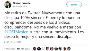"No le deseo el mal a nadie, no deseaba que se hiciera viral lo que dije. Soy homofóbico y la verdad no hay mucho que pueda hacer sobre eso, así soy. Me nace ser así. Lo que dije estuvo mal y le debo una disculpa a todos. Así que perdon si lastime a alguien. Pero es mi opinión".