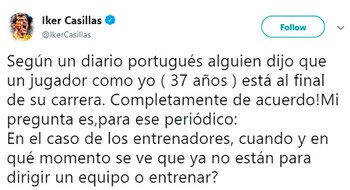 "Según un diario portugués alguien dijo que un jugador como yo ( 37 años ) está al final de su carrera. Completamente de acuerdo! Mi pregunta es, para ese periódico: En el caso de los entrenadores, ¿cuándo y en qué momento se ve que ya no están para dirigir un equipo o entrenar?", fue el mensaje que dejó Casillas en su cuenta de Twitter, apenas horas después de otra dura derrota del Manchester United de Mourinho frente al Liverpool en Anfield.
