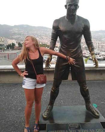 La escultura tiene un bulto en la zona de la ingle que provoca que los turistas se diviertan y hagan divertidas -y provocativas- imágenes junto al delantero de la Juventus.