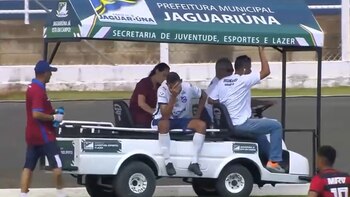 Evidentes gestos de dolor mostraba el jugador del Trindade Go tras ser arrollado por el carrito médico. Afortunadamente la lesión no pasó a mayores y, tras permanecer unos minutos en el suelo, pudo reincorporarse y volver a ingresar al campo nuevamente para continuar el partido.