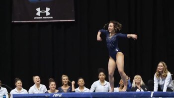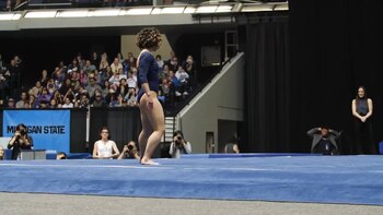 Fue un minuto y medio de piruetas, movimientos de baile y saltos por los aires absolutamente precisos. Sin fallas. Con una sonrisa en la cara de comienzo a fin. Terminó exultante. Saludó a sus entrenadores y a todo el equipo de la Universidad de California (UCLA) con un choque de manos. El estadio explotaba.