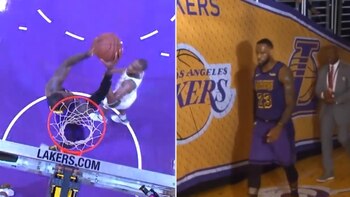 A falta de 2 minutos y medio para finalizar la primera mitad, el de Akron aprovechó un rebote que dejó su compañero Kyle Kuzma, quien no pudo encestar en su oportunidad, y sin dudarlo tomó la pelota en el aire, se giró sobre sí mismo y realizó una volcada que aplaudió todo el estadio y dio de qué hablar en las redes sociales. Con esa conversión los Lakers se ponían en ventaja por 58 a 57.