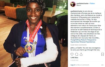 "Estoy saliendo de este Campeonato de Europa de la mejor manera, con una lesión en el codo después de ganar la medalla de bronce en 103 kilogramos. Recibí muchos mensajes de apoyo que me hicieron sentir bien y estamos esperando mi regreso a Francia para realizar más pruebas. Quiero agradecer al personal médico y técnico de la Federación que respondió muy rápidamente y que está a mi lado. Al igual que a mis entrenadores y mis colegas del equipo de Francia", escribió Nayo-Ketchanke en su cuenta de Instagram junto a una foto de su brazo inmovilizado.