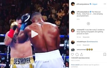 "El Rocky mexicano, Andy Ruiz Jr… un logro asombroso", escribió "Sly" en una publicación en su cuenta oficial de Instagram que acompañó con un videomontaje de Ruiz golpeando a Joshua y enviándolo de regreso a Reino Unido.