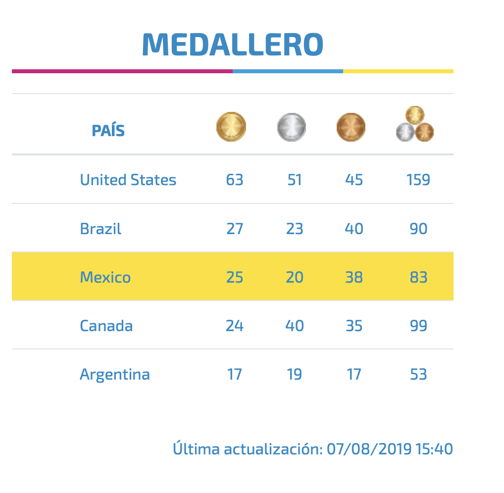 En aquella ocasión, sumaron 80 medallas en total: 23 oros, 20 platas y 37 bronces. En los últimos Panamericanos, disputados en Toronto 2015, los mexicanos sumaron 22 de oro, 30 de plata y 43 de bronce: 95 en total.