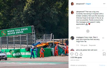 "Actualmente recuperándome en el hospital con una vértebra rota (D6). No estoy seguro del tiempo de recuperación, pero espero volver al monoplaza lo antes posible. Gracias a todos por los mensajes y el apoyo. Realmente lo aprecio", concluyó el australiano en su cuenta de Instagram en la que publicó una foto del momento en el que su vehículo quedó estacando sobre el muro de contención.